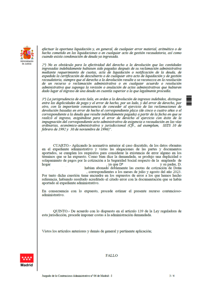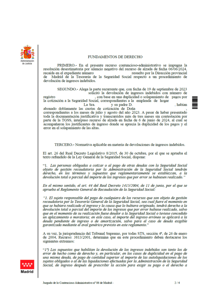 Un cliente había pagado varias veces las cotizaciones de su empleada del hogar. Tras no recibir respuesta de la Administración, interpusimos un recurso contencioso-administrativo.